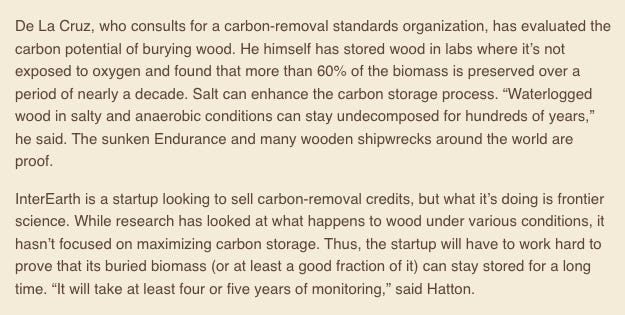 Shipwrecks can remain intact in saltwater for decades, and a startup is betting a similar idea can work for commercial carbon offsets. (read)
