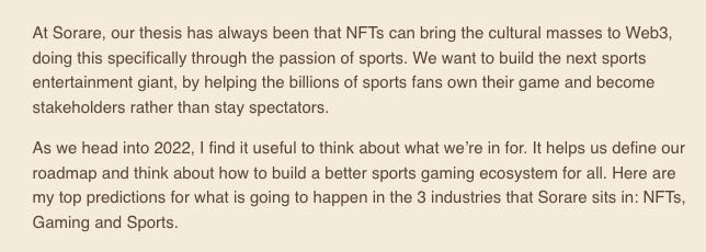 “2021 has been a landmark year for NFTs and Sorare. If you had asked me this time last year, I must admit I couldn’t have predicted such a breakout for NFTs this year. NFT sales surged past $10B in Q3, and we can expect close to $25B of NFT sales for 2021.” (read)