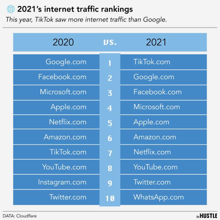 “We’ll focus on space (NASA and SpaceX flew higher), e-commerce (Amazon and Taobao rule), and social media (TikTok ‘danced’ to take the crown from Facebook). We’ll also take a little ‘bite’ on video streaming wars. Netflix is a Squid Game of its own and January 2021 was at the highest in our ranking — probably lockdown and pandemic-related.” (read)