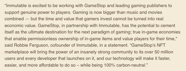 GameStop has teamed up with Immutable X to launch a marketplace for nonfungible tokens (NFTs) later this year. Immutable and GameStop are also creating an up-to-$100-million fund dedicated to providing grants to game developers and studios to build on Immutable X and the NFT marketplace. (read)